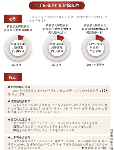 据昌平法院统计,2015年至2017年上半年,昌平新收合同类纠纷案件数量分别为13185件、13149件、7412件。其中涉及房屋买卖合同纠纷案件的情况为:2015年新收案件1006件,占合同类纠纷案件总数的比重为7.6%;2016年新收案件1299件,案件数量同比增长29%,占合同类纠纷案件总数比重为9.9%;2017年上半年新收案件965件,较2016年同期增长48%,占合同类纠纷案件总数的比重为13%。