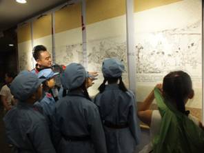 图为青少年们在听讲解员解说连环画上王定国奶奶的事迹