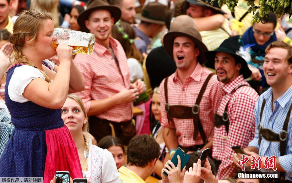 当地时间9月16日,第184届德国慕尼黑啤酒节开幕,这一世界上最大的啤酒节将从9月16日持续至10月3日。图为在啤酒节上豪饮啤酒的女子。