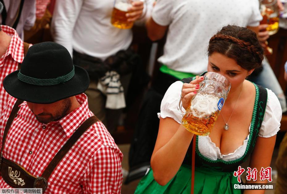 当地时间9月16日,第184届德国慕尼黑啤酒节开幕,这一世界上最大的啤酒节将从9月16日持续至10月3日。图为在啤酒节上豪饮啤酒的女子。