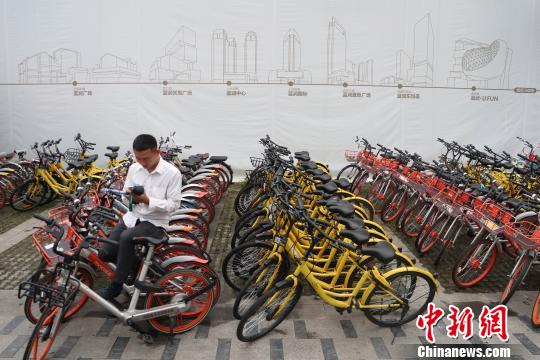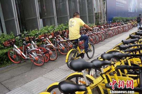 年轻人从一排共享单车前骑行经过。 张浪 摄