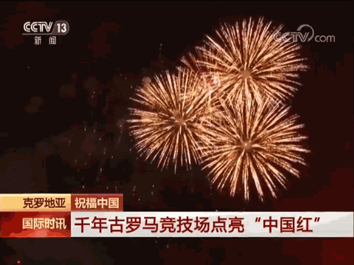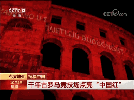 为了庆祝中国国庆和中克建交25周年,欧洲国家克罗地亚海滨城市普拉的一座古罗马竞技场进行了一场点亮中国红的活动。