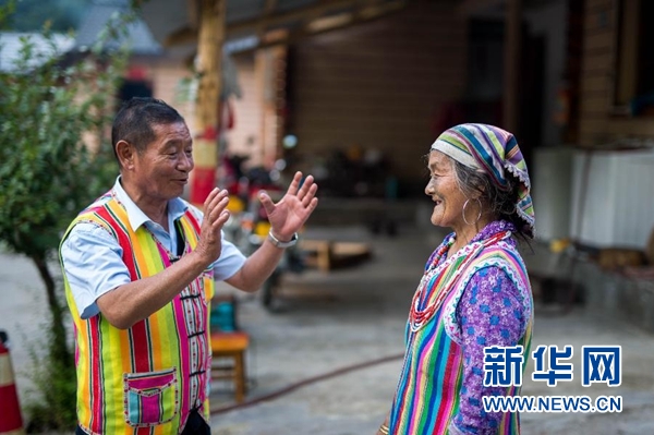 在云南省怒江傈僳族自治州贡山独龙族怒族自治县独龙江乡,独龙族“老县长”高德荣(左)和村民聊天(9月16日摄)。新华社记者胡超摄