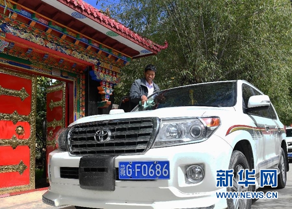 西藏林芝八一镇巴吉村村民格桑旺久在家门前擦拭新买的越野车(9月15日摄)。新华社记者晋美多吉摄