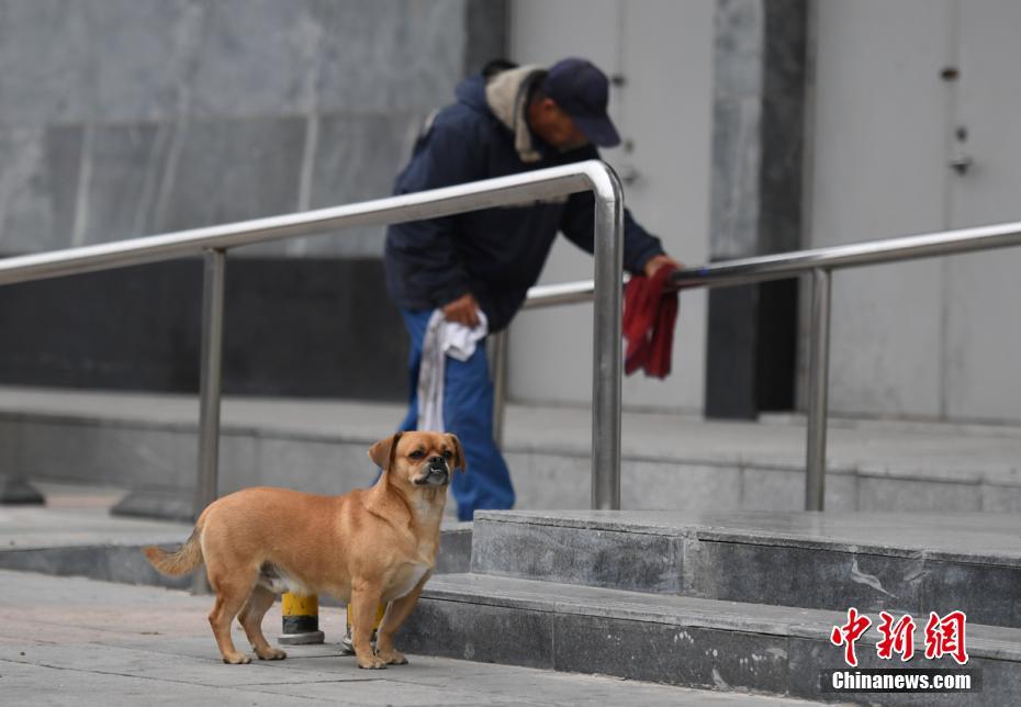 10月11日,长春一家居广场前,小狗“虎子”乖巧地守候在主人身边。“虎子”的主人是一名清扫工,每天早上五点开始工作,小狗“虎子”会不停地帮助主人捡垃圾,无论寒冬酷暑,始终相随,十分感人。中新社记者 张瑶 摄