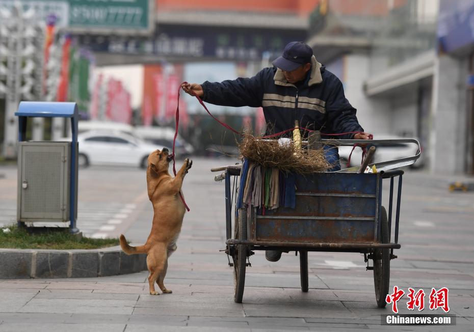 10月11日,长春一家居广场前,小狗“虎子”与主人玩耍。“虎子”的主人是一名清扫工,每天早上五点开始工作,小狗“虎子”会不停地帮助主人捡垃圾,无论寒冬酷暑,始终相随,十分感人。中新社记者 张瑶 摄