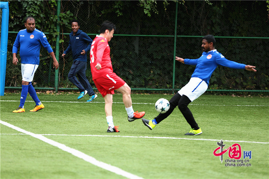 10月14日,外交部亚洲司和马尔代夫驻华使馆官员举行足球友谊赛,共同庆祝中马建交45周年。中国网 王东海 摄