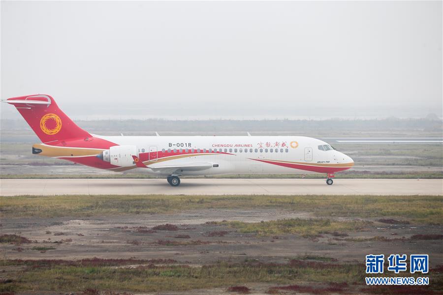 在山东东营胜利机场,ARJ21-700新支线喷气客机在跑道上滑行(10月14日摄)。记者从中国商飞公司了解到,10月19日,中国商飞公司在山东东营向成都航空公司交付第三架ARJ21-700新支线喷气客机,这是中国商飞公司总装制造中心正式批产后交付的首架飞机。新华社记者丁汀 摄 图片来源:新华网