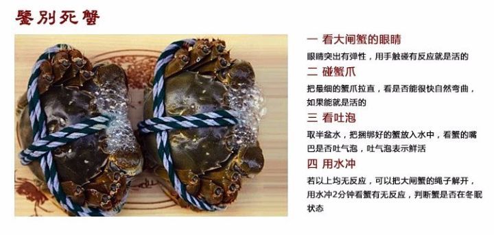 新鲜活蟹的外壳呈青黑色,具有光泽,脐部饱满,腹部白洁。而垂死的蟹外壳呈黄色,蟹脚较软。