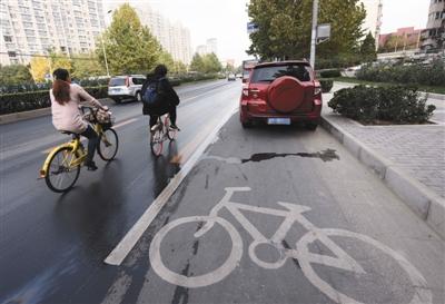 新京报记者探访发现,六里屯石佛营一带路边违停、画线停车现象普遍,自行车道被长期占用。骑行时,不到5分钟就需下车推行。此外,市区多条非主干道同样存在自行车道占用现象。昨日,六里屯街道办公室回应称,已有工作人员介入处理。