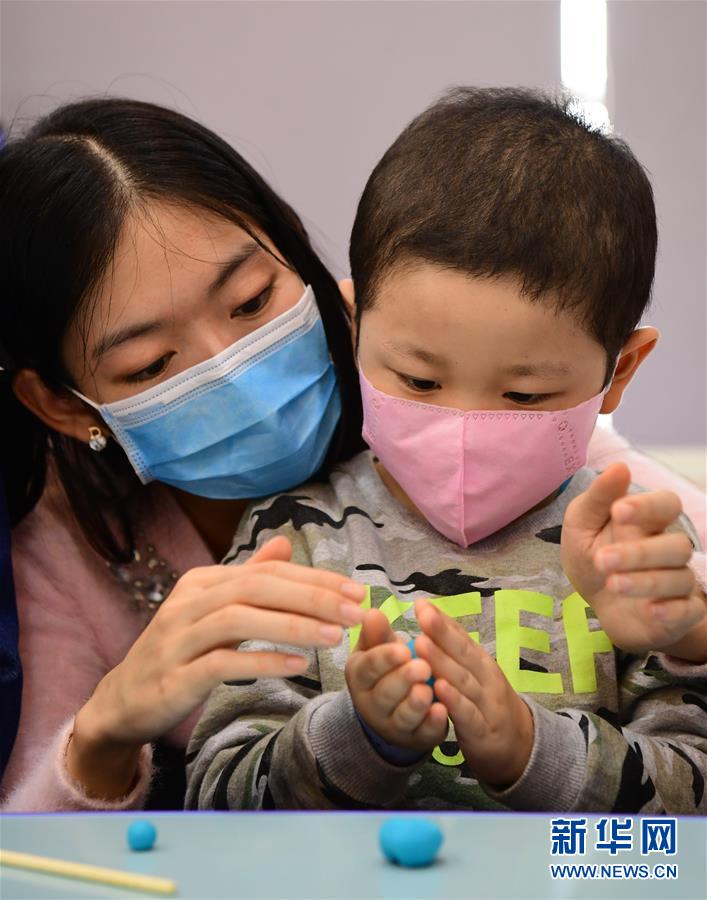 11月3日,志愿者老师任洁(左)在西安市儿童医院教室内指导一名小朋友捏面人。