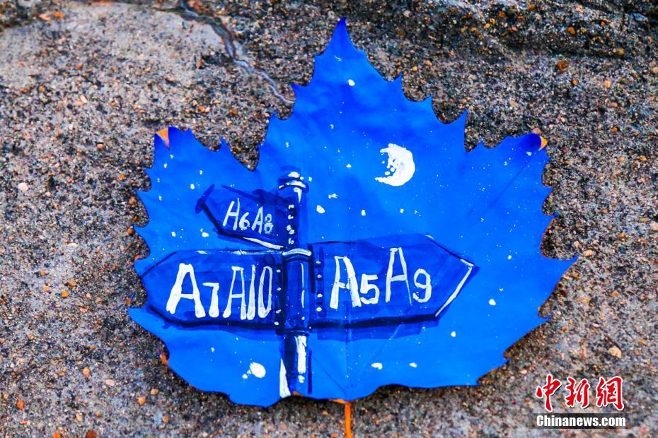 谈到创作思路,作品的主要负责人许嘉玲说:“今年的梧桐落叶格外好看,因而就想到要在叶子上画些什么。”想法浪漫,但实际操作起来可没那么简单,在选择画笔时她们就遇到了难题,“普通的马克笔不容易上色,而且颜色也并不鲜亮,水粉在绘制时又干的特别快,还容易掉渣,于是我想到了专业课上老师提到过的丙烯材料,试过之后发现它干得很慢而且不易掉渣。”图为“星空”下的学校。文/杨毅 图/许嘉玲