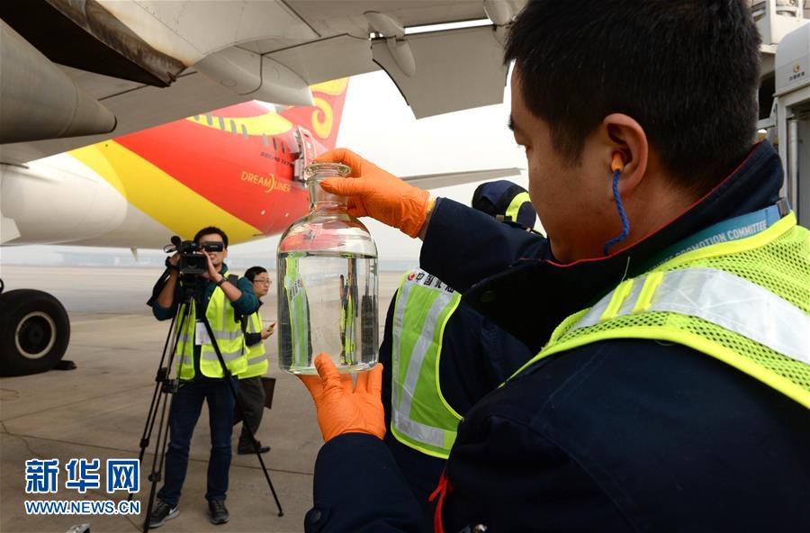 11月21日,在北京首都国际机场,工作人员在海南航空HU497航班的波音787客机前展示生物航煤。新华社发(胡庆明 摄)