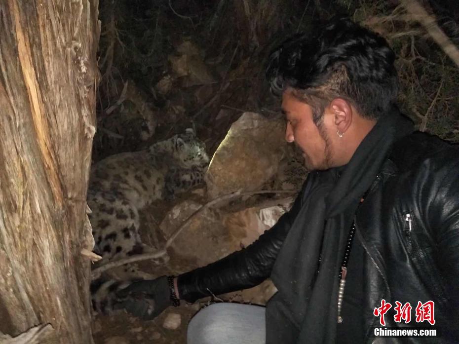 本月24日22点左右,昂赛乡村民达杰、南达、曲查、多才等开车时,在路边发现一只雪豹卧在路边,下车查看时雪豹一瘸一拐走动,之后又在树边躺下。图为受伤雪豹。文/罗云鹏 图/达杰