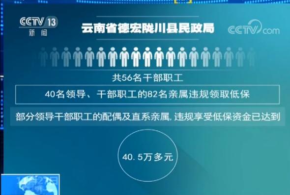调查发现,陇川县民政局56名干部职工,有40名领导、干部职工的82名亲属,违规享受着城乡低保。而部分领导干部职工的配偶及直系亲属,违规享受的低保资金,达到40.5万多元。