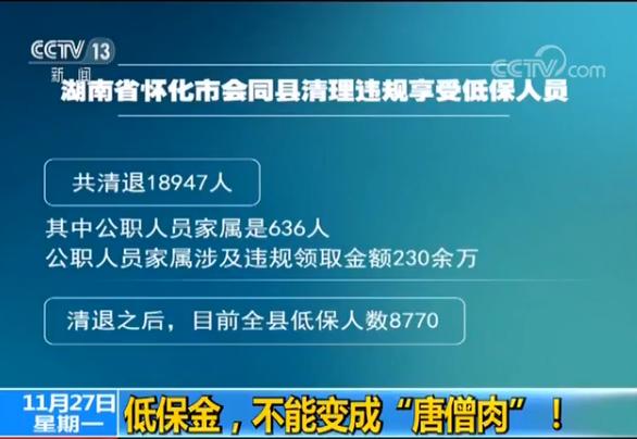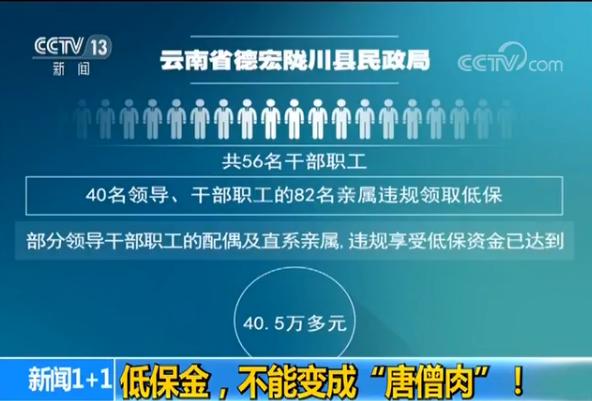 刚才我们看到两个案例,先是湖南的会同县,根据昨天当地纪委公布的这个数据,刚才说到近1万9000名违规享受低保的人员当中,636人是国家公职人员的亲属,追回了总共是230多万,5天前被媒体曝光的,刚刚我们说到的第二个云南德宏的陇川县,一个县民政局一共56名职工70%,40名领导干部职工的家属,82名亲属违规的吃低保,吃了40.5万多元,我们给他算一下,平均下来82个人40名干部,一个领导干部和职工就有两个亲属违规吃低保,这个数字这个比例70%,着实让人吃惊。