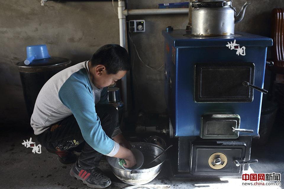 吃完饭后的马斌负责刷锅。农忙时节的假期里,两兄妹还会到地里帮忙做农活。