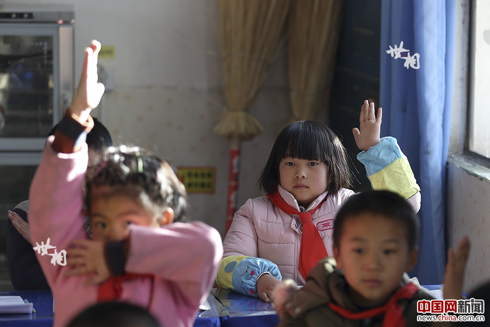 六岁的马蓉举手回答老师问题。这个性格内向的小女孩学习很认真,数学成绩在班里总能排到前两名。“我喜欢上学,因为可以学到很多知识。”