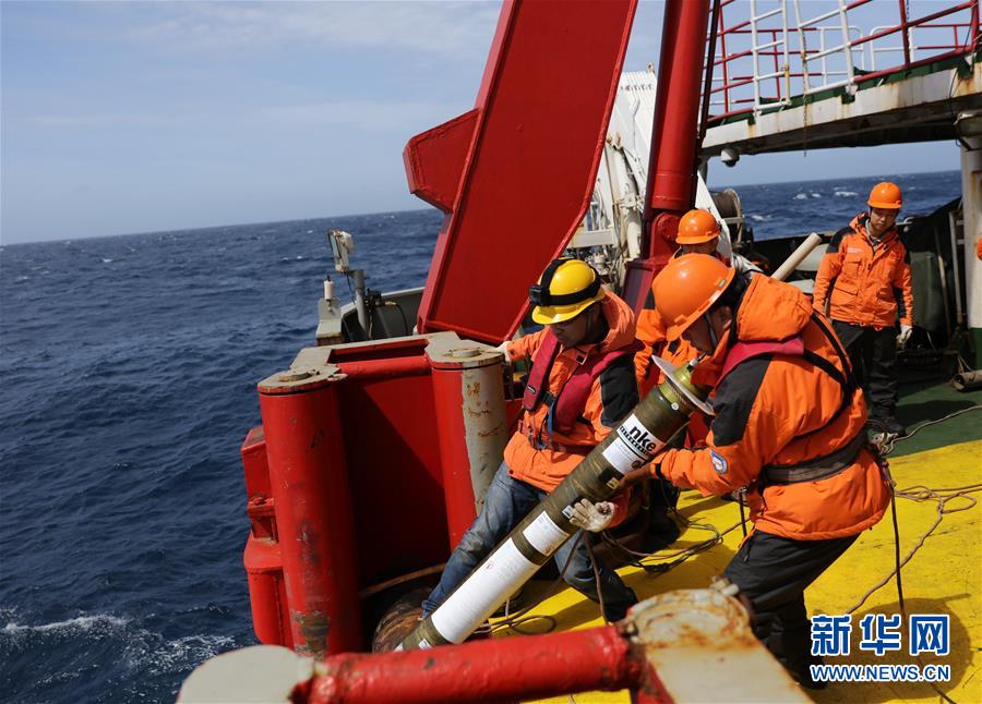 “雪龙”号穿越西风带时,科考队员韩正兵(前左)和矫玉田(前右)合力将ARGO浮标投放到海中(11月30日摄)。搭载着中国第34次南极科学考察队的“雪龙”号极地考察船目前已进入南极。“雪龙”号于11月8日从上海出发,根据计划,第34次南极科学考察队将在南极恩克斯堡岛为中国建设第五个南极考察站做前期准备工作。新华社记者白国龙摄
