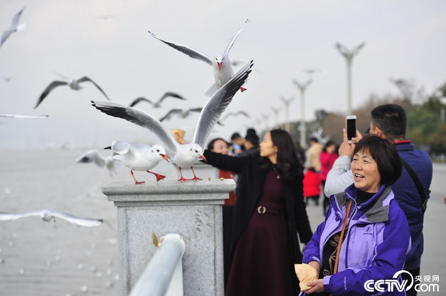 央视网消息:2017年12月4日,云南昆明大量游客在滇池边观赏红嘴鸥,进入冬季,越来越多的红嘴鸥从西伯利亚飞来昆明越冬。视觉中国