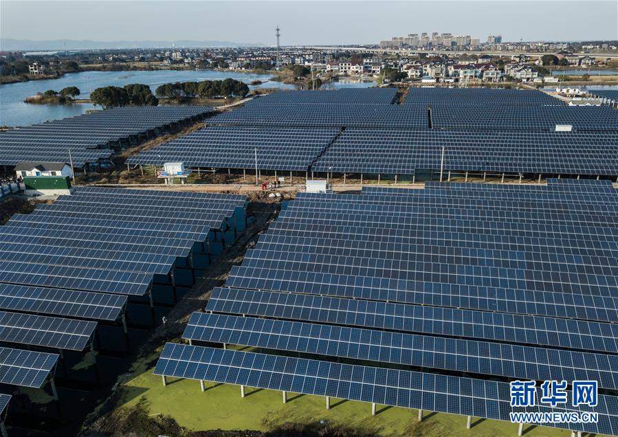 12月8日拍摄的长兴县洪桥镇古龙村的“渔光互补”光伏发电设备。近日,位于浙江省长兴县洪桥镇古龙村的大型“渔光互补”光伏发电示范项目的光伏发电设备全部并入当地电网,正式并网发电。据了解,该项目总投资1.6亿元,总水域面积485亩,预计年均发电量约1900万千瓦时,相当于每年节约标准煤6300吨,既保护了生态环境,又改善了电力能源结构。新华社记者徐昱 摄