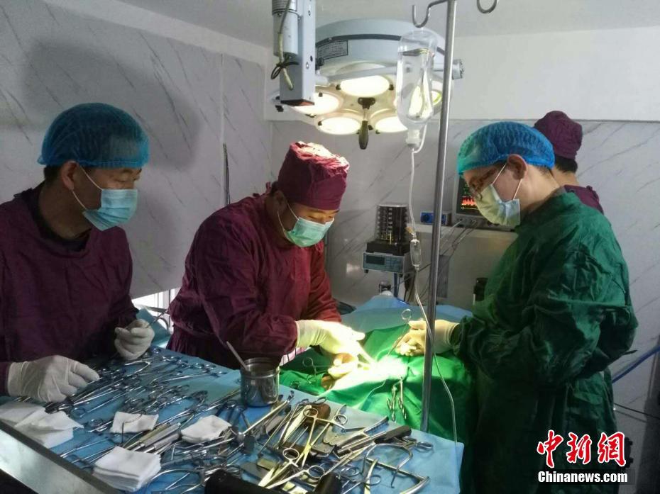 雪豹素有“高海拔生态系统健康与否的气压计”之称,1996年《中国濒危动物红皮书》已将其列为濒危物种,目前中国是全球雪豹最大分布国,涵盖其60%的栖息地,其中三江源地区雪豹初步估算数量在1000只以上。图为手术现场。许昆 摄