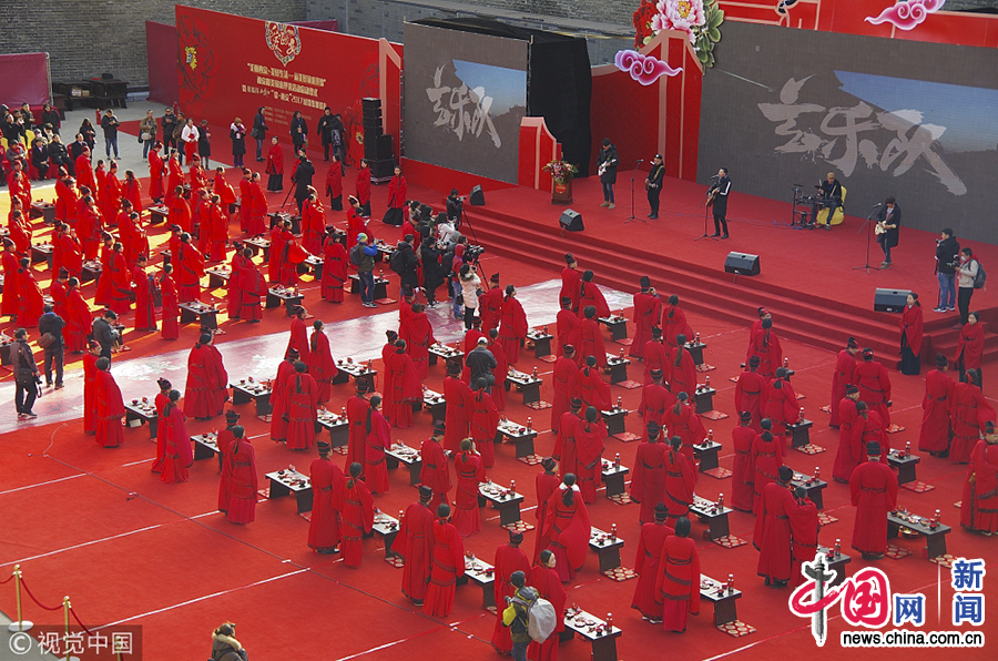 2017年12月16日,在西安明代城墙永宁门里,一场穿越千年的“汉代婚礼”热闹进行,近百对新人穿着华丽的汉服,在赞礼官的主持下经过行交拜礼、沃盥礼、合卺礼、执手礼等古香古色的 “汉式”传统婚礼流程,许下中国式爱情的承诺,结成百年之好,使广大游客们在喜庆的气氛中感受到了汉代婚礼和传统文化的独特魅力。