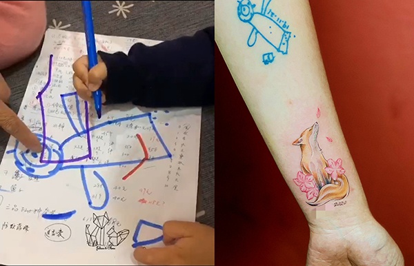 林迪手上的两个纹身。一个是儿子画的”妈咪“,是和孩子刚分离时纹的;一个是一只代表儿子的小狐狸,是在5月31日儿子生日那天纹的。