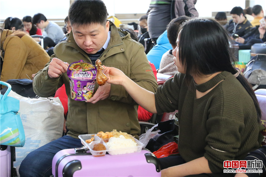 1月13日,2017春运开始,北京火车站候车大厅,旅客一边吃饭一边候车。中国网记者 尚阳 摄