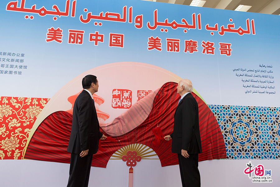 中国网4月23日讯(记者 王侃 段崴) 当地时间4月21日,由中国国务院新闻办公室、摩洛哥王国文化新闻部、中国驻摩洛哥王国大使馆、摩洛哥王国国家图书馆、中国外文局联合主办的“美丽中国 美丽摩洛哥”图片展开幕式在摩洛哥首都拉巴特的摩洛哥王国国家图书馆举行。中共中央政治局委员、中央书记处书记、中央宣传部部长刘奇葆,摩洛哥王国国王顾问安德烈·阿祖莱,摩洛哥王国文化新闻大臣穆罕默德·阿拉基,中国驻摩洛哥王国大使孙树忠等百余名嘉宾出席开幕式。中国外文局局长张福海在开幕式上致辞。