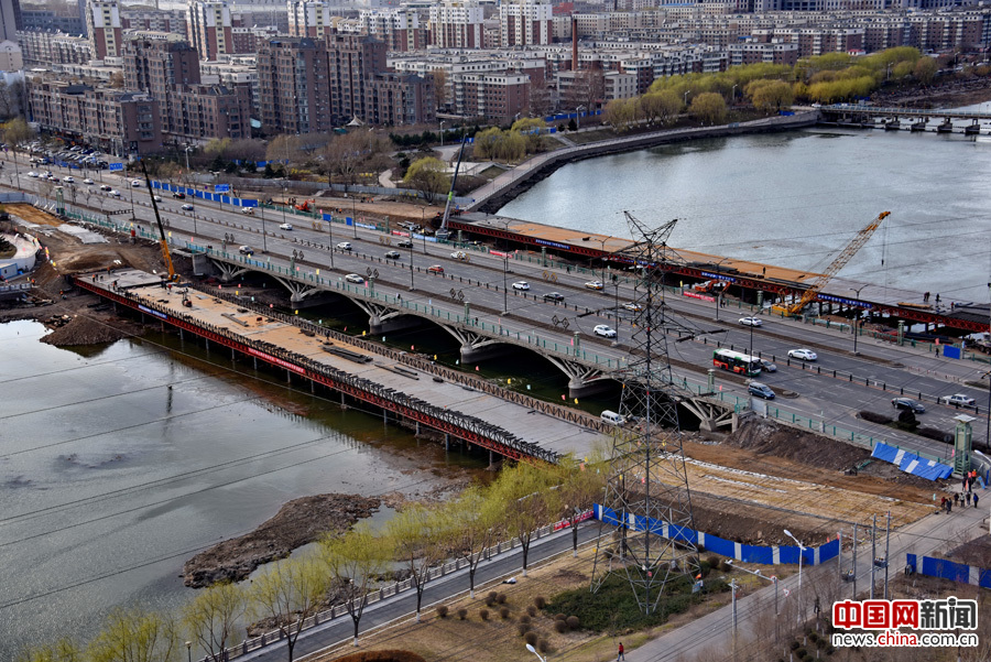 2016年起,长春伊通河全面改造,自由大桥是其中一个改造项目。图为施工人员在修建辅桥。张卫 摄