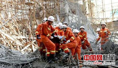 12时27分,广安市特勤消防中队到场后,经现场侦察和询问知情人了解到,现场建筑施工脚手架发生大面积垮塌,五楼正在作业的4名工人不幸掉落,造成3人受伤被送往医院救治,其中1人经抢救无效死亡,另有1名工人仍被埋压在施工现场。