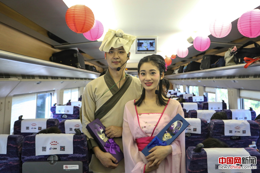 2017年8月27日,万州北开往重庆北C6403次列车上,“牛郎织女,高铁相会”活动现场,“牛郎织女”合影。包亮 摄影