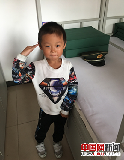 2017年9月16日,北京,刘英带5岁的儿子参加党性教育活动,在国旗护卫队战士的床前留影。中国网记者 董小迪 摄