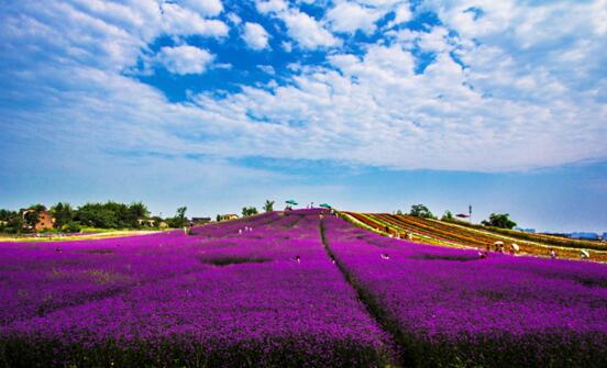 向日葵、格桑花、薰衣草、波斯菊、玫瑰、百日草……20多个品种的黄、红、粉、紫等交相辉映,好像一轮彩虹悬浮在空中, 这一片片美丽的花海就是巴岳山下的黄桷门奇彩梦园。