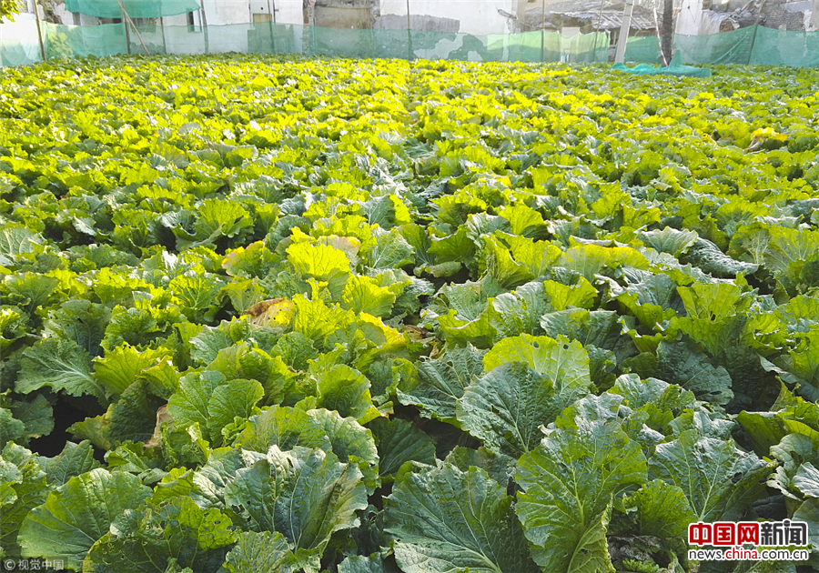 两片菜地都呈方形,四周用水泥砖块围起来,东边的菜地里,一半是排列整齐的大白菜,另一半种的是白萝卜和青萝卜。大白菜刚刚抱团,还未长成;手腕粗的萝卜根茎已经高高地“跃出”泥土之上。西边的菜地里,则种着大白菜和菠菜。风一起,隔路相望的两块菜地里的绿叶波荡。