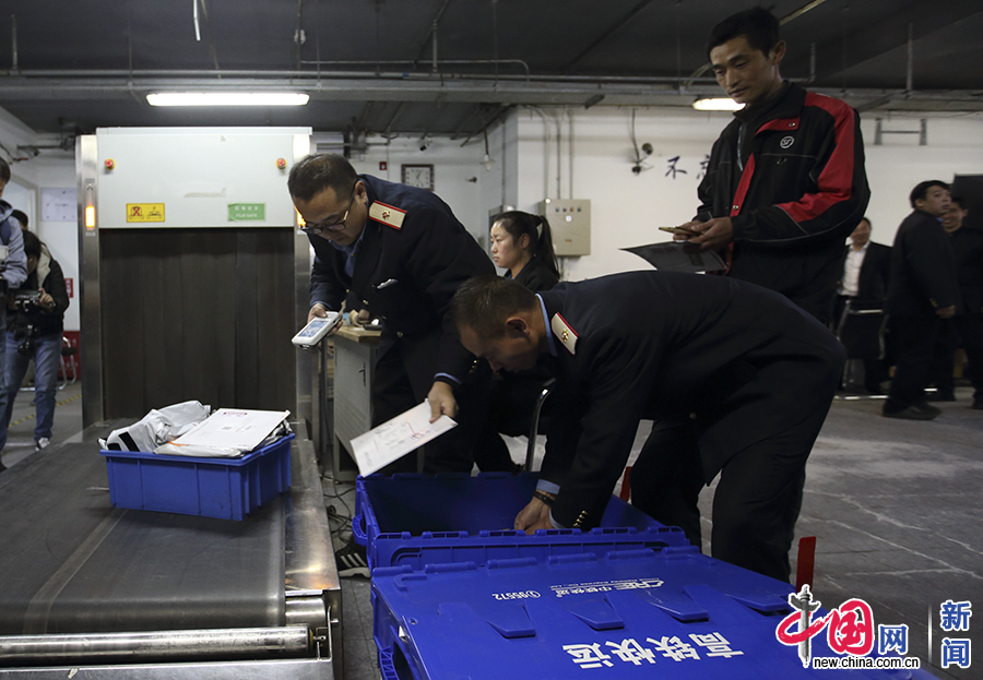 2017年11月9日,北京南站,“高铁极速达”快运试运营,快件放入专门的快运柜之前,需要进行安检并扫描确认。自11月11日起至20日,铁路部门将在京沪高铁“复兴号”列车上推出高铁“高铁极速达”快运新产品,保证10小时货物送达客户。中国网记者 陈维松 摄