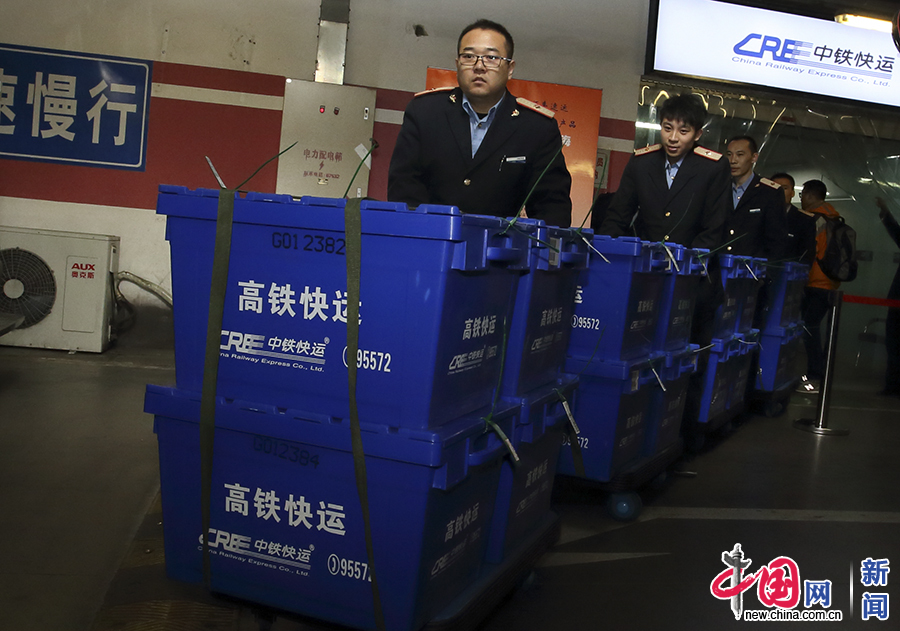 2017年11月9日,北京南站,“高铁极速达”快运试运营,工作人员推着装好的快运柜,准备上站台。自11月11日起至20日,铁路部门将在京沪高铁“复兴号”列车上推出高铁“高铁极速达”快运新产品,保证10小时货物送达客户。中国网记者 陈维松 摄