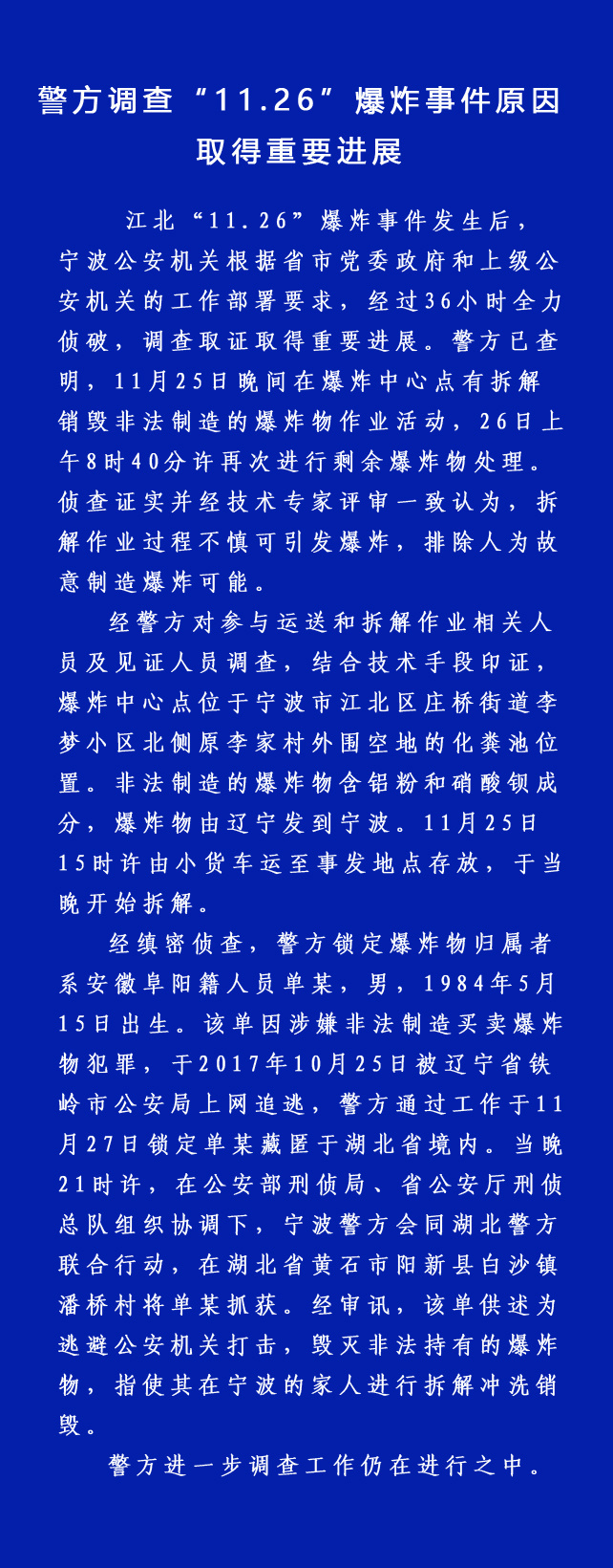 中国网11月28日讯 据浙江省宁波市公安局官方微博消息,宁波警方今日公布了宁波市江北区“11.26”爆炸事件原因最新进展。警方查明11月25日晚间,在爆炸中心点有拆解销毁非法制造的爆炸物作业活动。26日上午8时40份许再次进行剩余爆炸物处理。专家认为,拆解作业过程不慎可引发爆炸,排除人为故意制造爆炸可能。