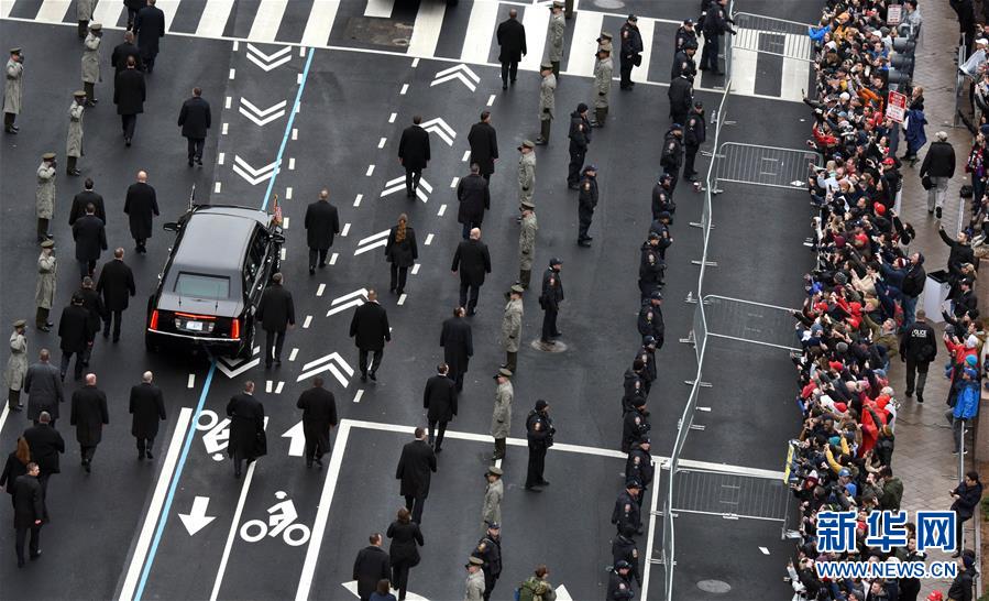 1月20日,在美国首都华盛顿举行的总统就职游行上,美国总统特朗普乘坐的专车在宾夕法尼亚大道上行进。美国总统特朗普的就职游行20日在华盛顿举行。特朗普当日在华盛顿国会山举行的就职典礼上正式宣誓就任美国第45任总统。新华社记者殷博古摄