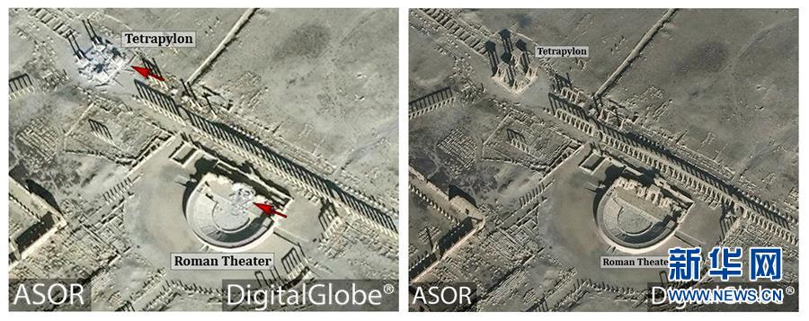 这张1月20日发布的拼版照片中,右图是2016年12月26拍摄的叙利亚古城巴尔米拉古罗马露天竞技场的卫星图,左图是2017年1月10日拍摄的遭到破坏后的露天竞技场的卫星图。据叙利亚通讯社1月20日报道,极端组织“伊斯兰国”毁坏了历史古城巴尔米拉的地标建筑、古罗马时期的露天竞技场。巴尔米拉古城位于叙首都大马士革东北约215公里处,是一座古罗马风格遗址,有2000多年历史,1980年被联合国教科文组织列入世界文化遗产名录。新华社/美联
