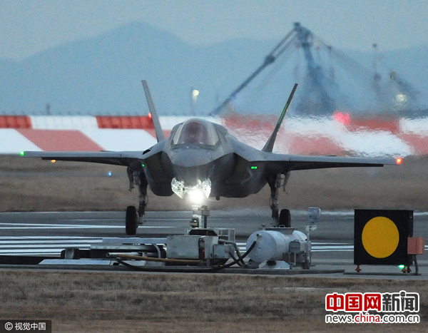 当地时间2017年1月18日,日本山口县,美国海军陆战队的F-35战机飞抵驻日美军岩国基地开始进行部署。这是美国首次在本土以外地区部署该机型。(Michiko Takei/视觉中国)