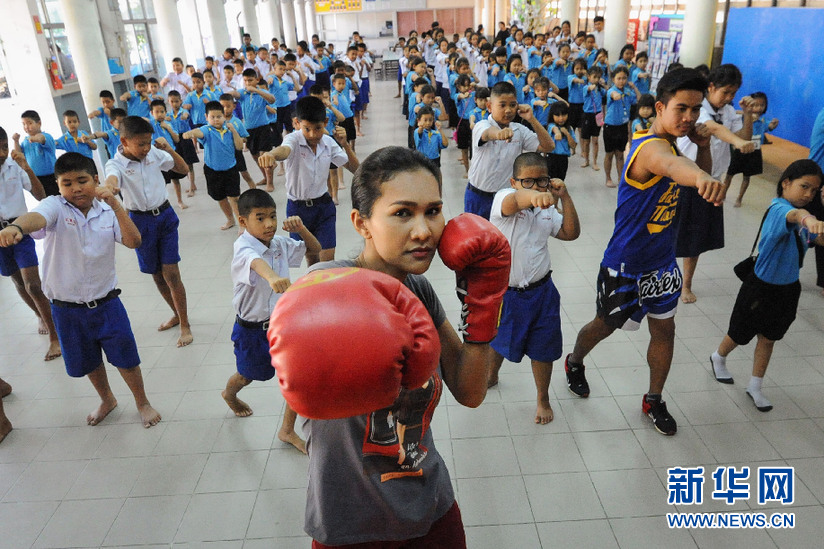 在泰国曼谷市郊的一所小学,芭利娅(前)带领学生们练习泰拳动作技巧。 新华网发(拉亨 摄)