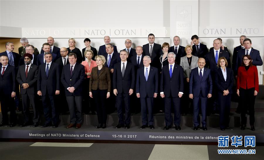 2月15日,在位于比利时布鲁塞尔的北约总部,与会人员在北约防长会期间合影。北约秘书长斯托尔滕贝格15日在北约防长会后的新闻发布会上表示,各国防长认为跨大西洋关系在应对安全挑战方面至关重要,当天会议还就增加军费问题进行了讨论。新华社记者叶平凡摄
