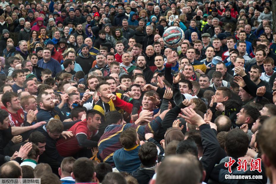 当地时间2017年2月28日,英国阿什本,当地举办一年一度的忏悔节足球赛,比赛队伍分成“上游队”和“下游队”,比赛的球场没有边界,球门是两个相距3英里的柱子。这一游戏历史悠久可以追溯到17世纪。
