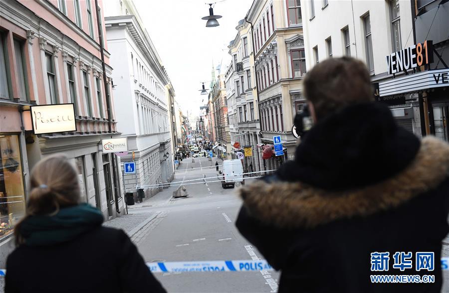 4月7日,在瑞典斯德哥尔摩,卡车袭击事件现场被封锁。新华社/法新
