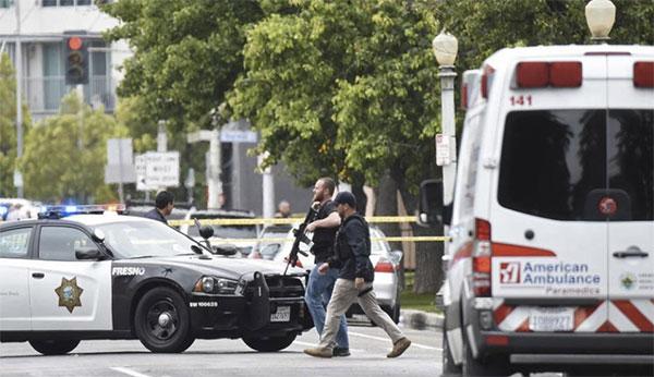 根据美国媒体报道称,当地时间18日,美国加州弗雷斯诺(Fresno)发生枪击案,造成3人死亡。目前,警方已经拘捕39岁的犯罪嫌疑人Kori Ali Muhammad。当地警方表示,枪手在4个不同地点发射了约16枚子弹,枪手跟警方对峙时高喊“Allahu Akba”(真主至大)。(央视记者 魏雪娇)
