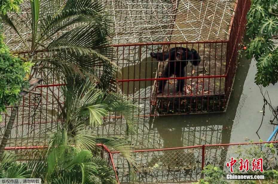 动物园里的一只黑猩猩被洪水困在笼中一角。