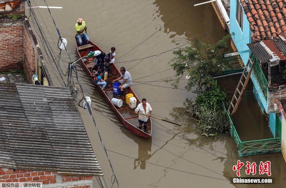 卡利当地街道被淹,居民靠独木舟出行。