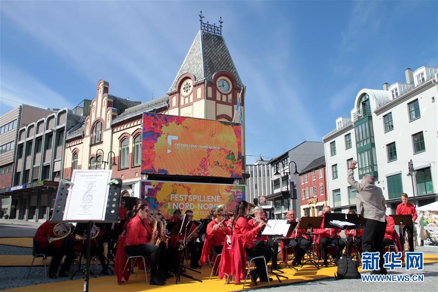 6月24日,在北极圈内的挪威小镇哈尔斯塔,交响乐团在北极艺术节上表演。当日,北极艺术节在挪威小镇哈尔斯塔开幕。本届北极艺术节于6月24日至7月1日举行,来自挪威、瑞典、俄罗斯、美国、冰岛、加拿大等国的艺术家用音乐、舞蹈、绘画以及舞台剧等方式展示环北极地区的文化艺术。新华社记者梁有昶摄